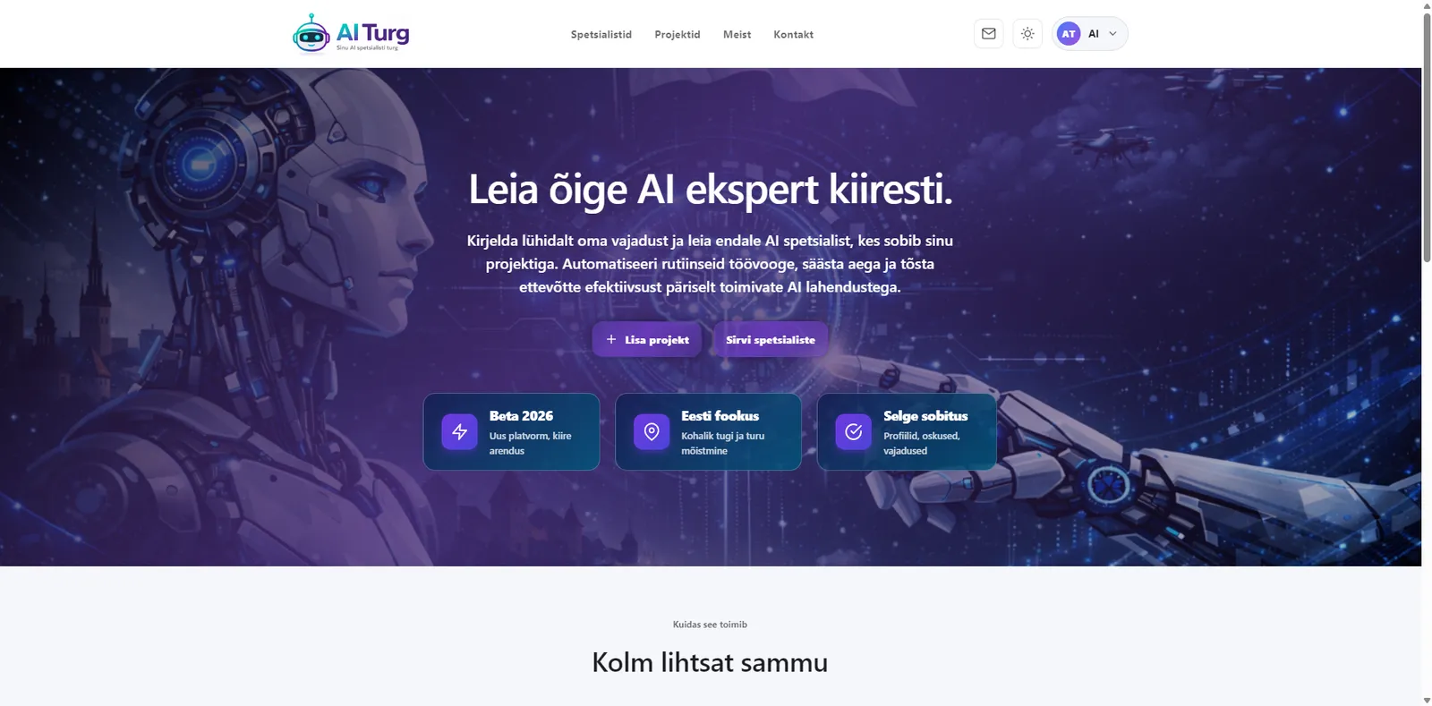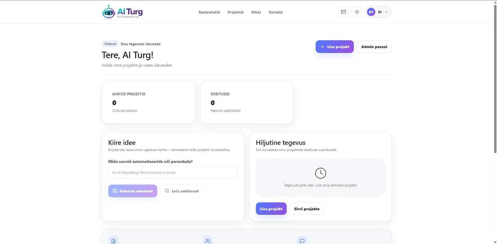 AI Turg on spetsialiseeritud portaal, mis viib kokku ettevõtted ja AI valdkonna spetsialistid. Platvormi eesmärk oli luua selge, usaldusväärne ja skaleeritav keskkond, kus saab postitada projekte, sirvida profiile ning leida kiiresti sobiva AI partneri. Lahendus ühendab kaasaegse kasutajakogemuse, läbimõeldud sisustruktuuri ja tehnilise paindlikkuse, et toetada platvormi kasvu nii Eestis kui ka rahvusvahelisemalt.