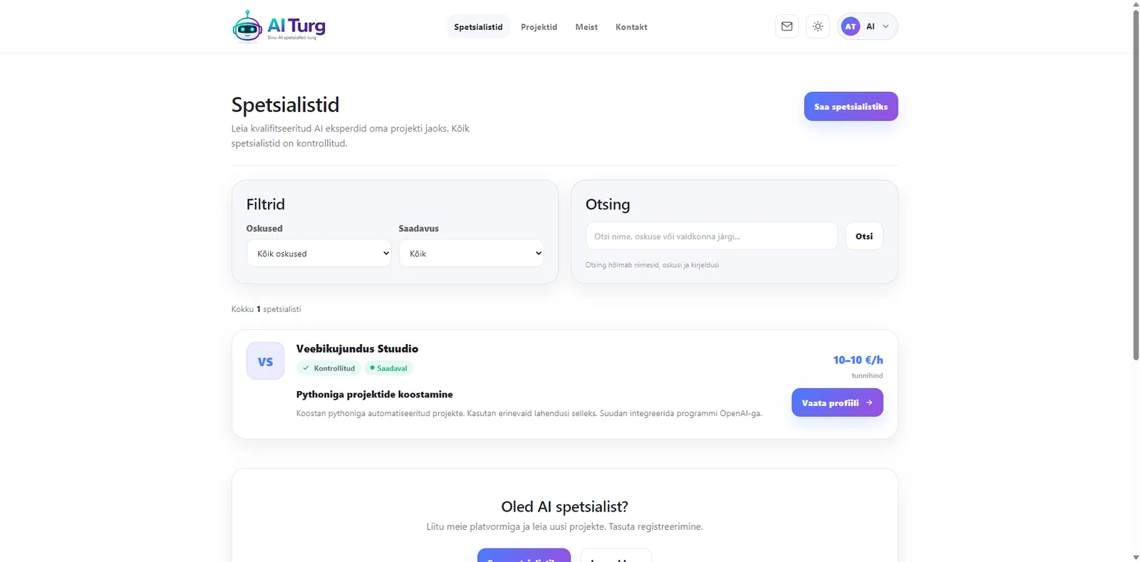 AI spetsialistid, AI projektid, tööportaal, digitaalne marketplace, kakskeelne veebilahendus, profiilid, projektipostitused, SEO, skaleeritav platvorm